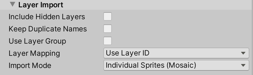 **Import Mode** | Use this property to specify how the layers from the source file are imported. This property is set to **Individual Sprites (Mosaic)** by default.