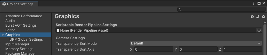 5. To set the graphics quality settings, there are two options: __Option 1: For a single setting across all platforms__ 1. Go to __Edit > Project Settings__ and select the __Graphics__ category. ![](Images/2D/2d-urp12-graphics-srpsettings.png)