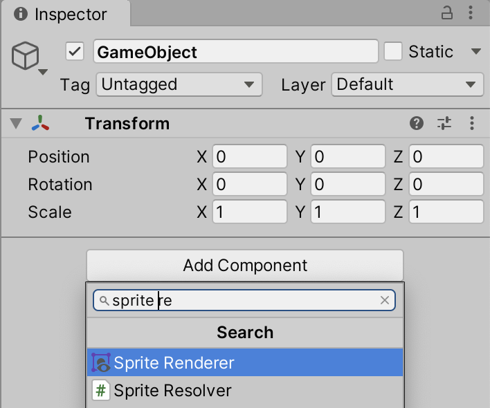 7. Add the [Sprite Resolver](SLAsset.md#sprite-resolver-component) component to the same GameObject.