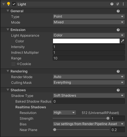 | __Mode__| Specify the [Light Mode](https://docs.unity3d.com/Manual/LightModes.html) used to determine if and how a light is "baked". Possible modes are __Realtime__, __Mixed__ and __Baked__.|