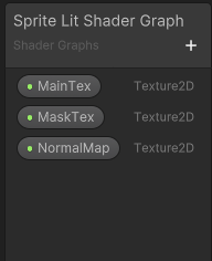 6. Create three **Texture 2D** properties by selecting the **+** on the [Blackboard](http://docs.unity3d.com/Packages/com.unity.shadergraph@12.0/manual/Blackboard.html), and then select **Texture 2D**. Name them 'MainTex', 'MaskTex', and 'NormalMap' for this example.