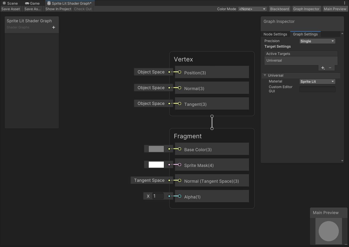 1. Create a new Asset by selecting __Assets > Create > Shader Graph > URP > Sprite Lit Shader Graph__. The Shader Graph Asset is then created in the Asset window.