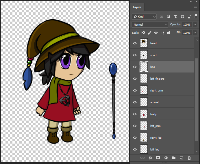 Example 1: Layered character artwork in Adobe Photoshop. Once the artwork is imported, a Prefab is generated from the graphic data of each layer as individual Sprites, which may be arranged in their original position or as a Sprite sheet depending on the selected [importer options](#psd-importer-features). The generated Prefab is referred to as an 'actor' when used with the 2D Animation package. ## PSD Importer features The PSD Importer has many features and options that prepare the actor for animation. For example, enable the [Mosaic](https://docs.unity3d.com/Packages/com.unity.2d.psdimporter@5.0/manual/PSD-importer-properties.html#Mosiac) option to have Unity automatically generate a Sprite sheet from the imported layers; or enable [Character Rig](https://docs.unity3d.com/Packages/com.unity.2d.psdimporter@5.0/manual/PSD-importer-properties.html#character-rig) to have Unity generate a Prefab with Sprites generated from the imported source file, with the Sprites arranged into their original positions based on the source file. Refer the [PSD Importer's documentation](https://docs.unity3d.com/Packages/com.unity.2d.psdimporter@latest) for more information about the different options and their functions. ![](images/2DAnimationV2_Mosaic_Prefab.png)
