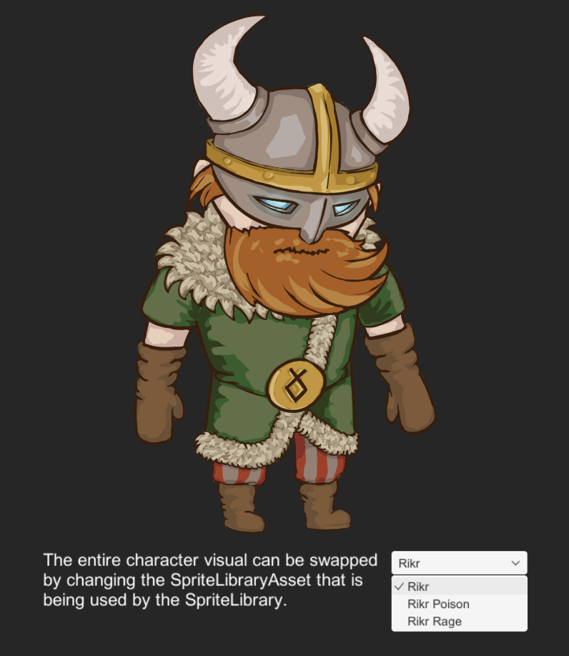 7. Add the [Animator component](https://docs.unity3d.com/Manual/class-Animator.html) to the `dialog` and `dialog gray` GameObjects. Locate the Dialog [Animator Controller Asset](https://docs.unity3d.com/Manual/Animator.html) in `Assets/Samples/2D Animation/[X.Y.Z]/Samples/5 Sprite Swap/Animation/Animators` and assign it to the Animator component's **Controller** property. In this sample, the Sprite Library component is not attached to the same GameObject as the Sprite Resolver component. The Sprite Resolver will attempt to locate a Sprite Library component starting from the same GameObject it is on and then traverse up the GameObject hierarchy. This makes it possible to have a single or multiple Sprite Resolvers use the same Sprite Library component by attaching the Sprite Library component to a common root GameObject that the Sprite Resolver components are attached to. ## Part Swap This sample demonstrates how to swap Sprite Assets using the API provided by changing the Sprite Resolver data. This sample uses some of the Assets and a similar setup to the [Multiple Skinned Sprites](ex-multiple-skinned-sprites.md) sample. Open the `3 Part Swap.unity` Scene to see the sample in action. ![](images/2D-animation-samples-partswap-Scene.png) In the Scene, each part has three different visual options that can be swapped. The graphic Assets are located in `Assets/Samples/2D Animation/[X.Y.Z]/Samples/5 SpriteSwap/Sprites`: - `Rikr.png` - `Rikr Poison.png` - `Rikr Rage.png` A [Sprite Library Asset](SLAsset.md) containing Sprites made from all three graphic Assets above is created. A Category is created for each body part of the actor, with three Entries derived from the three different versions of the character. The Asset is located in `Assets/Samples/2D Animation/[X.Y.Z]/Samples/5 SpriteSwap/Sprite Library/Rikr Full.spriteLib`. ![](images/2D-animation-samples-partswap-SLasset.png)Corresponding parts from each of the three versions of the actor, and named accordingly. Attach the Sprite Library component to the `Rikr_Root` GameObject in the Scene. Assign the `Rikr Full.spriteLib` Asset to its **Sprite Library Asset** property. Add the Sprite Resolver component to all Sprite Renderers under the `Rikr_Root` GameObject. Assign a Sprite that matches its corresponding GameObject, depending on the body part that GameObject represents. For example, select one of the Sprites in the 'Body' Category for the Sprite Resolver attached to the `Rikr_Body` GameObject and so on. ![](images/2D-animation-samples-partswap-SLasset-body.png) With this setup, you can swap any part of the actor to another Sprite individually. ### Swap part script A custom MonoBehaviour script called `SwapPart` is attached to the `Rikr_Root` GameObject. This script is located in `Assets/Samples/2D Animation/[X.Y.Z]/Samples/5 SpriteSwap/Scripts/Runtime/SwapPart.cs`. ![](images/2D-animation-samples-spriteswap-script.png) The script holds a reference to a Sprite Library component for retrieval of swappable Sprites. It also holds an array of data that describes the Category of Sprites in the Sprite Library that can be changed by a Sprite Resolver component. When the Swap Part script starts up, it will attempt to fetch the Sprite Library Asset that is used by a Sprite Library component. ```c++ var libraryAsset = spriteLibrary.spriteLibraryAsset; ``` From this Sprite Library Asset, it will then fetch the Entries and Label names that are in a Category. ```c++ var labels = libraryAsset.GetCategoryLabelNames(swapOption.category); ``` This is then used to populate the UI Drop Down list. When a value changes in the UI Drop Down List, it will then set the Sprite Resolver component to use the relevant Sprite. ```c++ swapOption.spriteResolver.SetCategoryAndLabel(swapOption.category, swapOption.dropdown.options[x].text); ``` ## Full Skin Swap This sample demonstrates how to swap Sprite visuals using the provided API by changing the [Sprite Library Asset](SLAsset.md) referenced by the Sprite Library component. Open the `4 Full Swap.unity` Scene to see the sample in action. ![](images/2D-animation-samples-fullswap-scene.png) In the Scene, there are three different visual Asset options that you can swap to. The Assets are located in `Assets/Samples/2D Animation/[X.Y.Z]/Samples/5 SpriteSwap/Sprites`: - `Rikr.png` - `Rikr Poison.png` - `Rikr Rage.png` The Sprite Library Assets have identical Categories, Entries, and Label names but with different Sprites selected. The Assets are located in `Assets/Samples/2D Animation/[X.Y.Z]/Samples/5 SpriteSwap/Sprite Library`. - `Rikr.spriteLib` - `Rikr Posion.spriteLib` - `Rikr Rage.spriteLib` Attach the Sprite Library component to the `Rikr_Root` GameObject. Assign the `Rikr.spriteLib` Asset to its Sprite Library Asset property. Add the Sprite Resolver component to each of the Sprite Renderers under the `Rikr_Root` GameObject. Assign a Sprite to each Sprite Resolver that corresponds to the body part they are attached to. For example, the `Body` Sprite is selected for the Sprite Resolver attached to the `Rikr_Body` GameObject. ![](images/2D-animation-samples-fullswap-sresolver.png) ### Swap Full Skin Script A custom MonoBehaviour script called `SwapFullSkin` is attached to the` Rikr_Root` GameObject. This script is located in `Assets/Samples/2D Animation/[X.Y.Z]/Samples/5 SpriteSwap/Scripts/Runtime/SwapFullSkin.cs` ![](images/2D-animation-samples-fullswap-script.png) Where a value changes in the UI Drop Down List, the component sets the relevant Sprite Library Asset to be used for the Sprite Library component. ```c++ spriteLibraryTarget.spriteLibraryAsset = spriteLibraries[value]; ``` ## DLC Swap This sample demonstrates how to swap Sprite visuals by changing the referenced Sprite Library Asset referenced by the Sprite Library component, using the API provided. This sample uses the Assets and a similar setup to the [Multiple Skinned Sprites](#ex-multiple-skinned-sprites) sample, and builds on the [Full Skin Swap](#full-skin