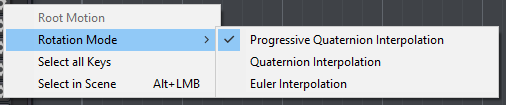 Rotation Mode Selects the Rotation Mode for the animated property (only available for rotation properties). If multiple animated properties are selected, this will affect all rotation properties in the selection.