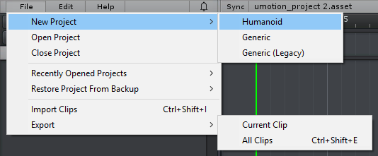 Close Project Closes the currently opened project. Projects are saved every time the Unity project is saved independently if the project is currently opened in UMotion or not.