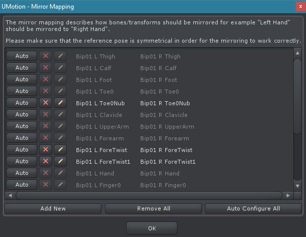 Auto Configure All Automatically generates the mapping for all bones/transforms in this UMotion Project file by using the automatic mapping algorithm.