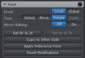 | Mirror Editing | When enabled, every editing action is automatically copied to the other side. It uses the Mirror Mapping to define which bone/transform maps to which bone/transform on the other side (e.g. "Left Hand" maps to "Right Hand"). |