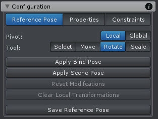| Apply Bind Pose | This will reset all bones to the pose in which they have been skinned in the 3D modeling application (usually the T-Pose). Transforms are not affected by this function. |