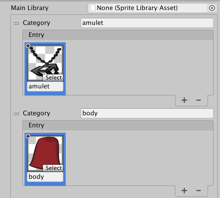 The Labels of the Categories and Entries retrieved from the Main Library property cannot be changed or removed. However, you can add new Entries to a Category which was retrieved from the Sprite Library Asset assigned to the **Main Library** property.