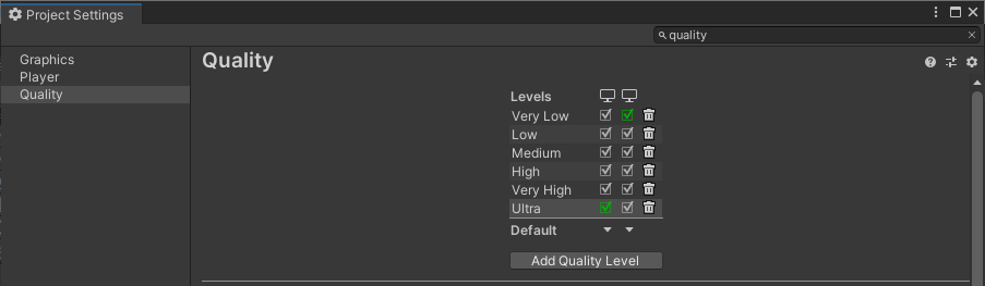 1. Go to __Edit > Project Settings__ and select the [Quality](https://docs.unity3d.com/Manual/class-QualitySettings.html) category.