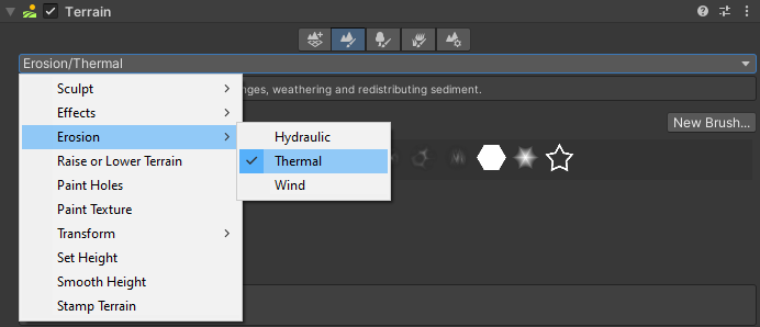 # Thermal Erosion Select a Terrain tile to bring up the Terrain Inspector. In the Terrain Inspector, click the **Paint Terrain** icon, and select **Erosion** > **Thermal** from the list of Terrain tools. ![](images/2-32-Thermal-Erosion-01.png) The Thermal Erosion Tool simulates the effect of sediment settling on a Terrain. Different sediment types naturally settle at specific slope angles, known as the *angle of repose* or *talus angle*. This Tool enforces such an angle on the Terrain height field, resulting in natural-looking slopes. ## Parameters ![](images/2-32-Thermal-Erosion-02.png) | **Property** | | **Description** | | ----------------------------- | ------------------------ | ------------------------------------------------------------ | | **Physical Material Presets** | | Use the drop-down to select the type of sediment material: