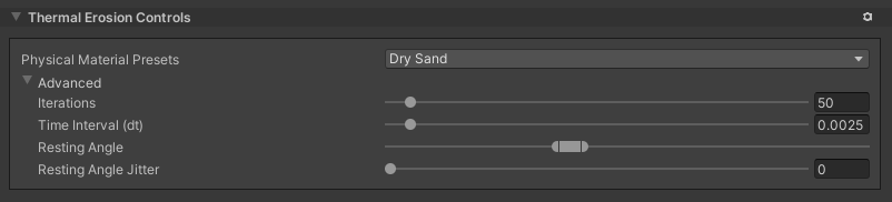 Each sediment material preset applies a default set of **Advanced** property values. | | **Advanced** | | Use the **Advanced** properties to customize the Thermal Erosion Brush. When you edit these properties, the **Physical Material Presets** property value changes to **Custom**. | | | **Iterations** | The number of simulation iterations to perform per Brush stamp. Specifying a higher value here produces a more accurate result, but impacts performance. | | | **Time Interval (dt)** | The time delta for each iteration of the erosion simulation. Higher numbers result in a greater visible effect, but values that are too high lead to simulation instability and inaccuracies. | | | **Resting Angle** | The angle of repose (talus angle). This is the angle at which sediment naturally settles. Slopes that are steeper than this angle will erode, while slopes less steep will remain untouched. | | | **Resting Angle Jitter** | A random offset per Brush stamp applied to the resting angle. Increasing this value results in more variation. |