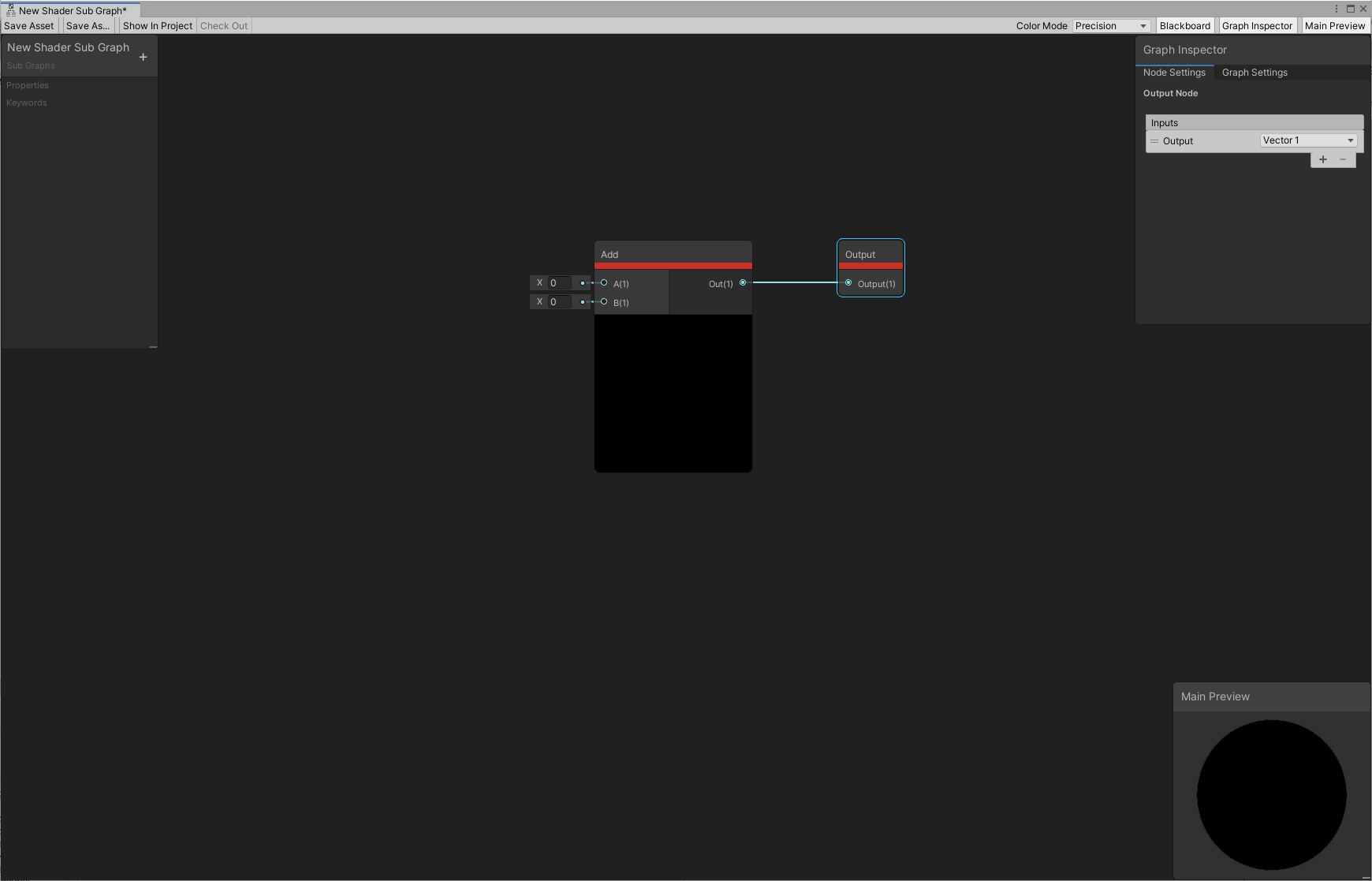 • A Sub Graph has its own Asset type. For more information, including instructions on how to make a new Sub Graph, see Sub Graph Asset.