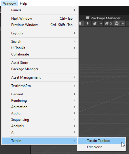To launch the Terrain Toolbox, select Window > Terrain > Terrain Toolbox.