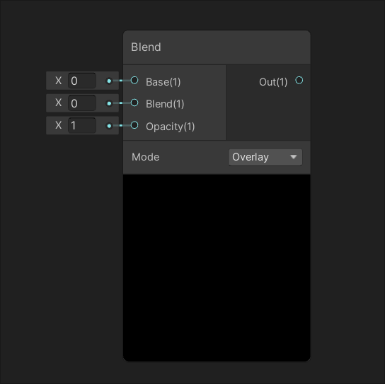 Blends the value of input Blend onto input Base using the blending mode defined by parameter Mode.