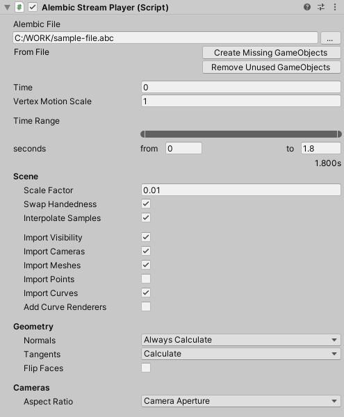 When you are using an imported instance of Alembic asset whose source is located in your Unity project, the properties of its Alembic Stream Player component are the following: