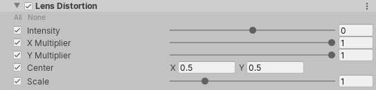 - In the Inspector, navigate to Add Override > Post-processing and click on Lens Distortion. URP now applies Lens Distortion to any Camera this Volume affects.