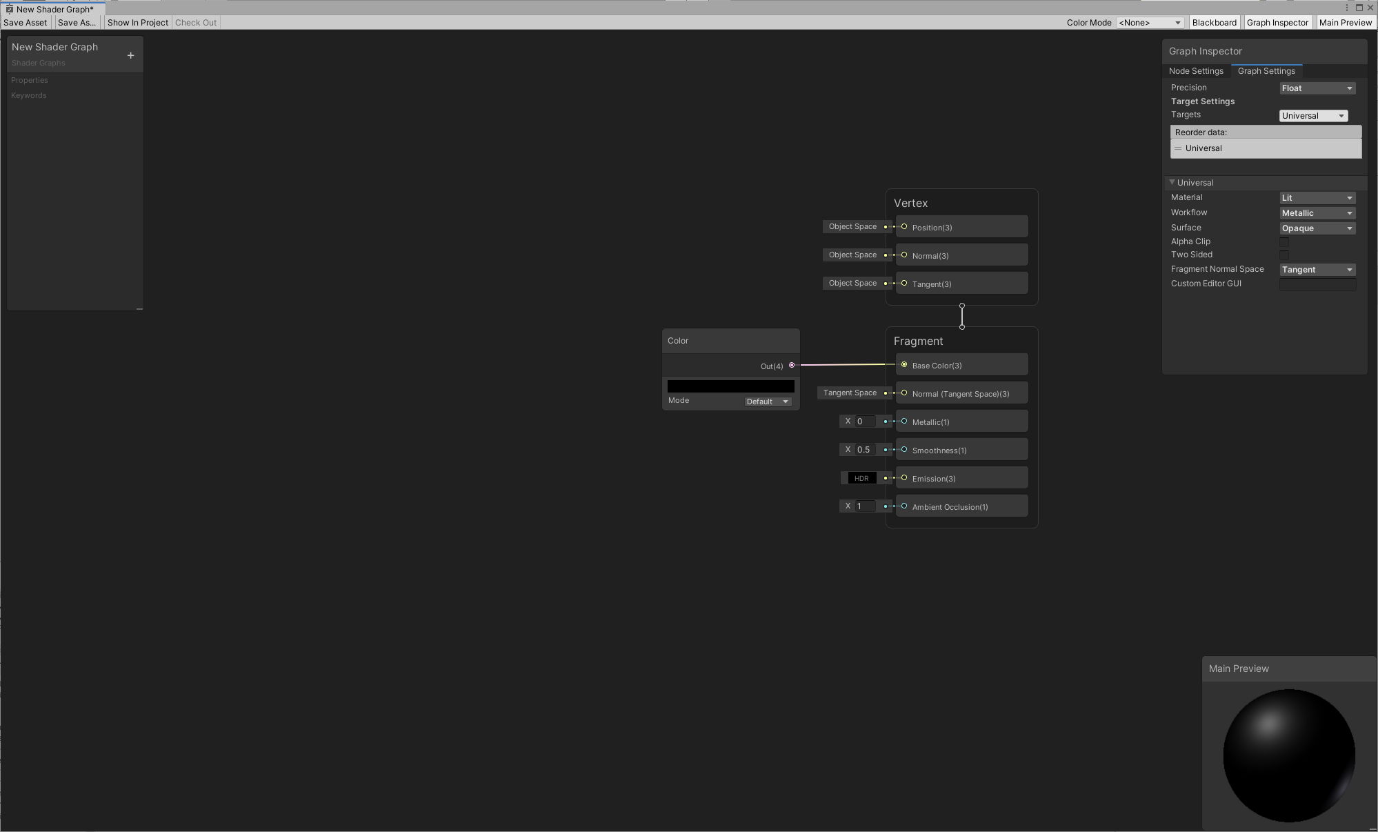 A Blank Shader Graph will create a Shader Graph with no selected active targets or block nodes. You will need to select a target via the Graph Settings Menu to continue.
