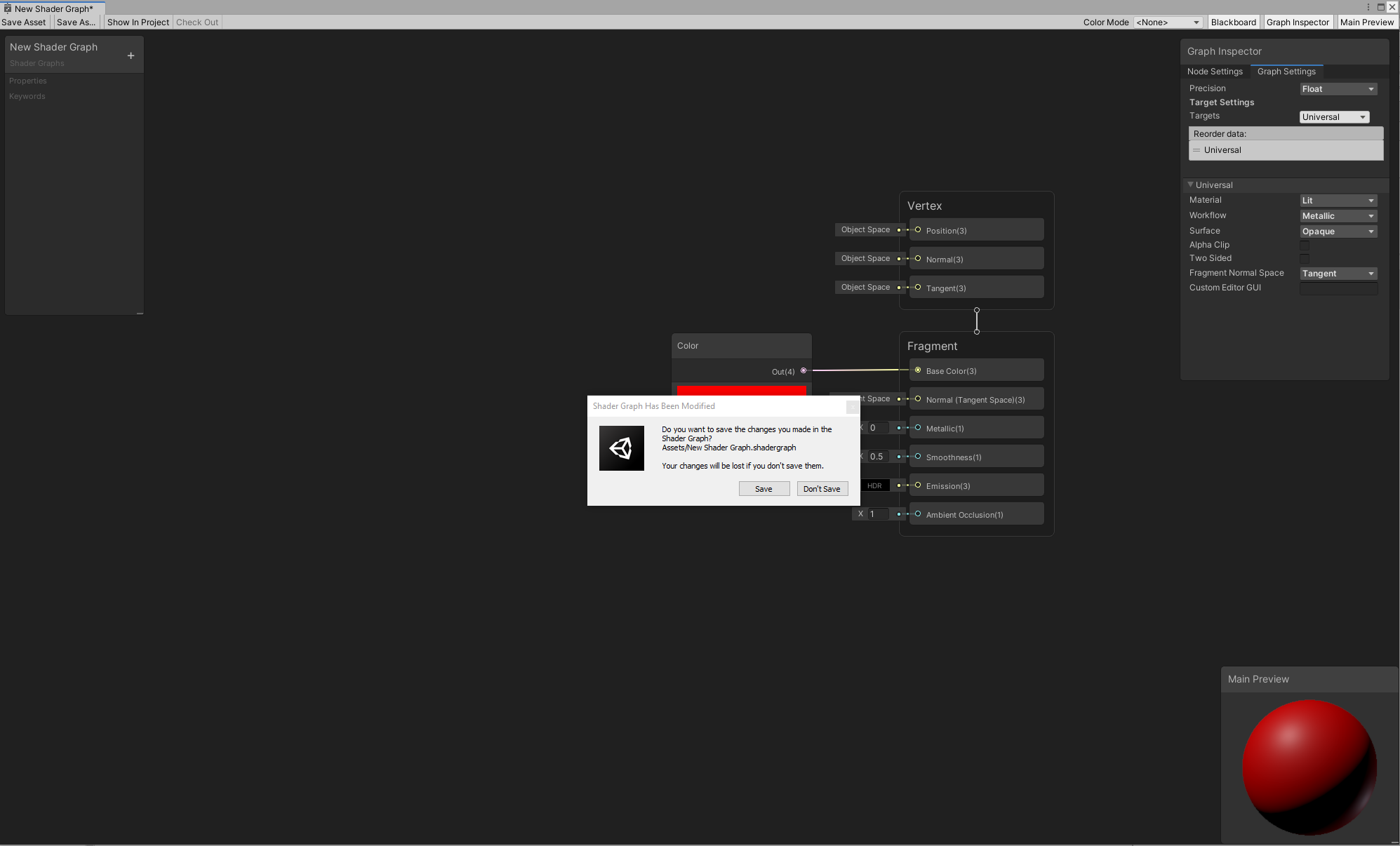 - Close the graph. If Unity detects any unsaved changes, a pop-up window appears, and asks if you want to save those changes.