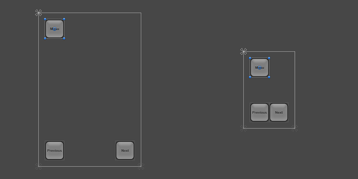 One way to keep the buttons inside the screen is to change the layout such that the locations of the buttons are tied to their respective corners of the screen. The anchors of the top left button can be set to the upper left corner using the Anchors Preset drop down in the Inspector, or by dragging the triangular anchor handles in the Scene View. It's best to do this while the current screen resolution set in the Game View is the one the layout is initially designed for, where the button placement looks correct. (See the UI Basic Layout page for more information on anchors.) Similarly, the anchors for the lower left and lower right buttons can be set to the lower left corner and lower right corner, respectively.