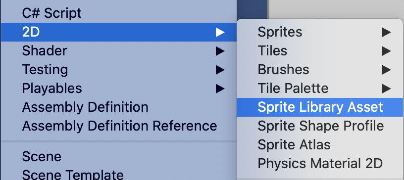 - Select the Sprite Library Asset from the Asset creation menu by going to Asset > Create > 2D > Sprite Library Asset