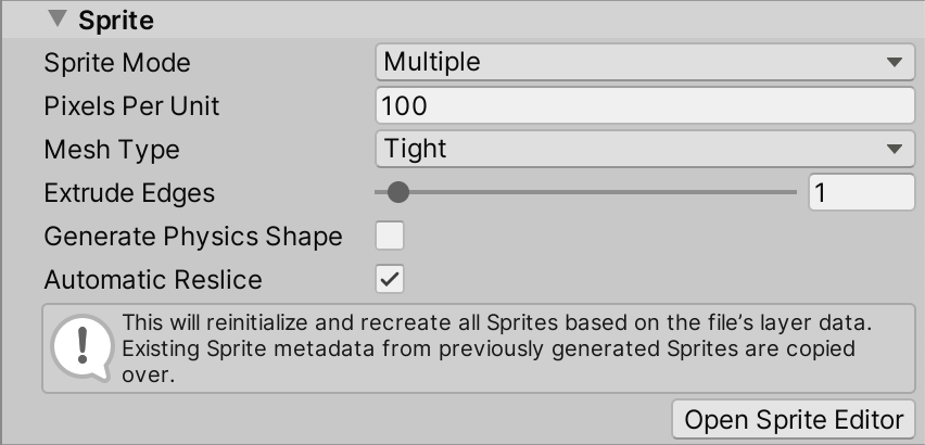| Automatic Reslice | This is available only when the Import Mode is set to Individual Sprites (Mosaic). Enable this setting to regenerate the Sprite from the imported layers and clear any changes you have made to the Sprite and its metadata. |