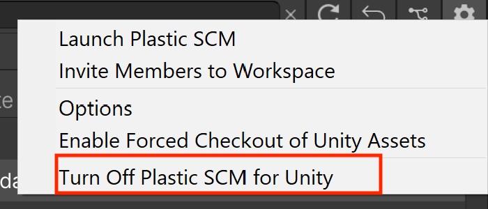 To switch from Plastic SCM to Collaborate, navigate to your Plastic SCM window, select Settings (gear icon) > Turn off Plastic SCM for Unity.