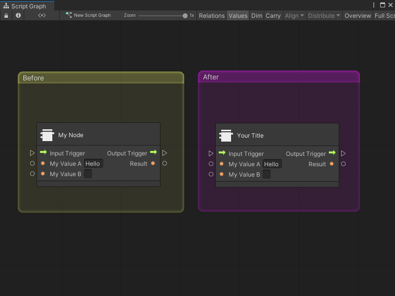 Succession(inputTrigger, outputTrigger); //To display that the input trigger port input will exits at the output trigger port exit. Not setting your succession also grays out the connected nodes but the execution is still done.