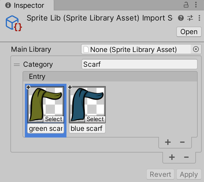 - Add new Entries into the Category by either selecting + and then selecting a Sprite from the Object Picker window; or by dragging a Sprite or Texture onto an empty space within the Entry