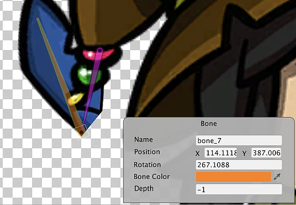 | Depth | Displays the Z-value of the selected bone that determines the render order of the vertices under its influence (refer to the examples below). Enter a new value (which can be negative) to change the render order of the affected vertices. Refer to the bone tab and hierarchy tree documentation for more information on how the Depth value affects the way the Sprite Mesh is rendered and deformed. |