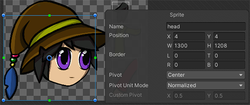 Original character prefab and its head Sprite with unmodified SpriteRect data. Character prefab with its head Sprites SpriteRect data modified.