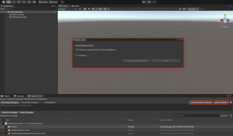 Unity connects your project to your Plastic SCM Cloud repository; Plastic SCM automatically creates an ignore file in the workspace for Unity projects so it doesn't track files that shouldn't be part of the repository. It also creates a standard automatic checkin during the initial setup. So now you're all set to start using Plastic SCM!