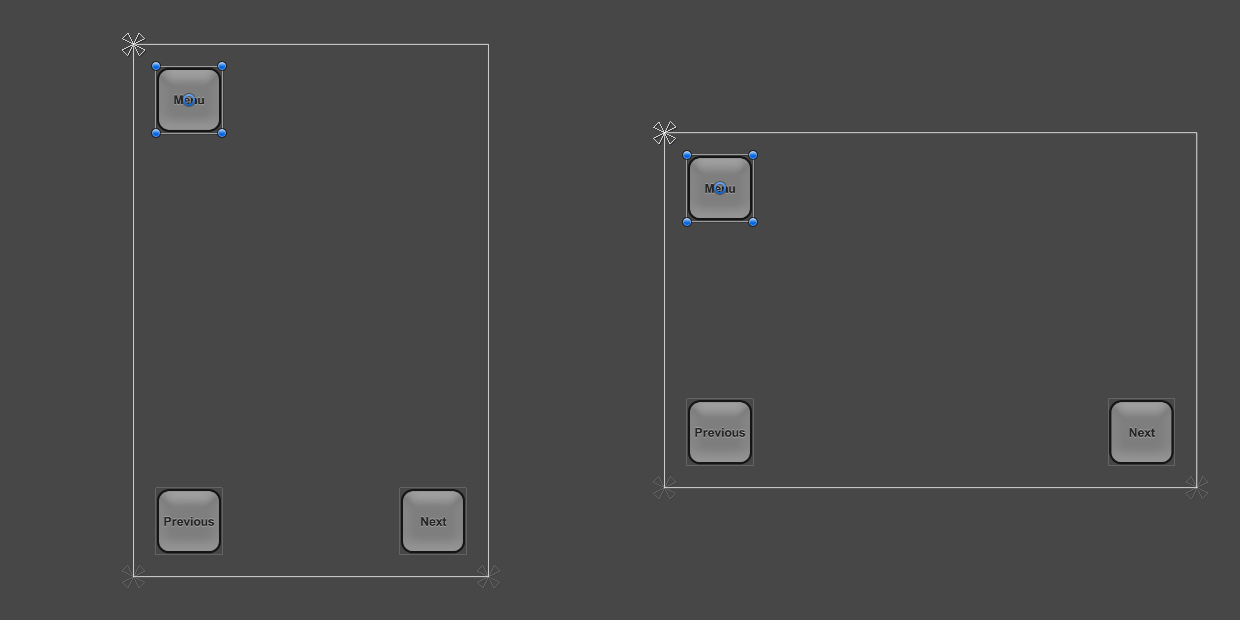 One way to keep the buttons inside the screen is to change the layout such that the locations of the buttons are tied to their respective corners of the screen. The anchors of the top left button can be set to the upper left corner using the Anchors Preset drop down in the Inspector, or by dragging the triangular anchor handles in the Scene View. It's best to do this while the current screen resolution set in the Game View is the one the layout is initially designed for, where the button placement looks correct. (See the UI Basic Layout page for more information on anchors.) Similarly, the anchors for the lower left and lower right buttons can be set to the lower left corner and lower right corner, respectively.
