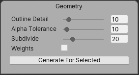 | Alpha Tolerance | Use the slider to set the alpha value threshold to consider when generating geometry. Pixels with an alpha value lower than the set tolerance value are considered transparent during outline detection when the geometry is generated. |