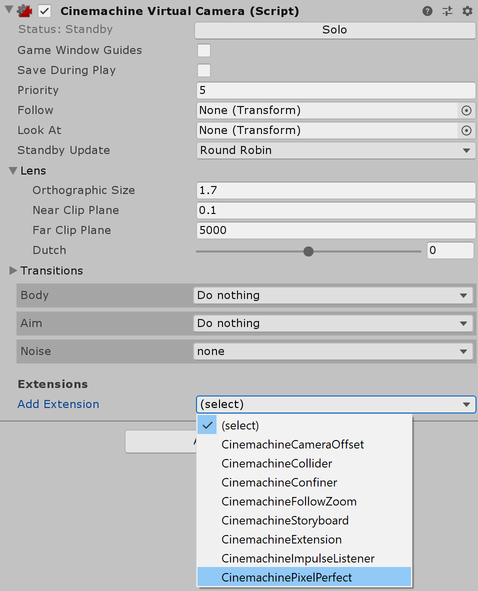 To add this extension to your virtual cameras, use the Add Extension dropdown menu on the Cinemachine Virtual Camera Inspector window. Add this extension to each virtual camera in your Project.