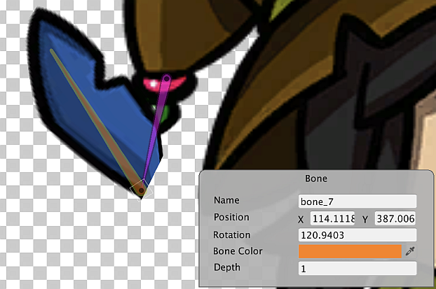 | Depth | Displays the Z-value of the selected bone that determines the render order of the vertices under its influence (refer to the examples below). Enter a new value (which can be negative) to change the render order of the affected vertices. Refer to the bone tab and hierarchy tree documentation for more information on how the Depth value affects the way the Sprite Mesh is rendered and deformed. |