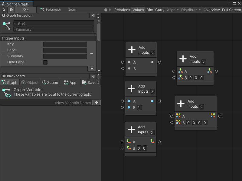 Instead of connecting to another node to receive a value, you can use a node's Inline Value field. Not all Visual Scripting types support Inline Value fields, but they can help to simplify your graphs. |